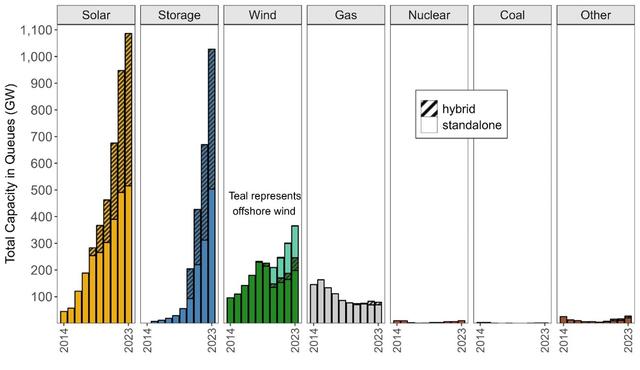 根據(jù)該報告,美國各地新能源發(fā)電和儲能項目的積壓問題進一步加劇。截至2023年底,有近2600GW的發(fā)電和儲能容量正在尋求接入電網(wǎng),是現(xiàn)有美國電廠裝機總量的兩倍有余,其中超過95%容量來自于清潔能源項目。