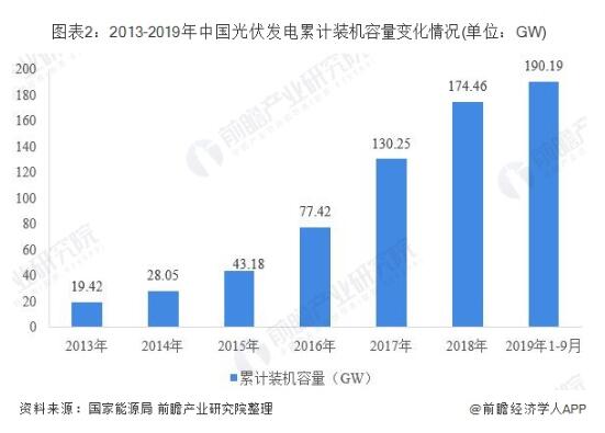 累計裝機容量方面,據(jù)國家能源局統(tǒng)計數(shù)據(jù)顯示,2013年以來,我國光伏發(fā)電累計裝機容量增長迅速。2013年,全國光伏發(fā)電累計裝機容量僅為19.42GW,到2018年已經(jīng)增長至174.46GW。預計2013-2019年,全國光伏發(fā)電累計裝機容量將有近10倍增長。截至2019年9月底,全國光伏發(fā)電累計裝機190.19GW,同比增長15%。