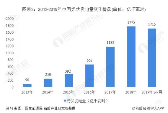 據(jù)國家能源局統(tǒng)計數(shù)據(jù)顯示,2013年以來,我國光伏發(fā)電量增長迅速。2013年,全國光伏發(fā)電量僅為90億千瓦時,到2018年,全國光伏發(fā)電量1775億千瓦時,同比增長50%;平均利用小時數(shù)1115小時,同比增加37小時。光伏發(fā)電平均利用小時數(shù)較高的地區(qū)中,蒙西1617小時、蒙東1523小時、青海1460小時、四川1439小時。截至2019年9月底,全國光伏發(fā)電量為1715億千瓦時。