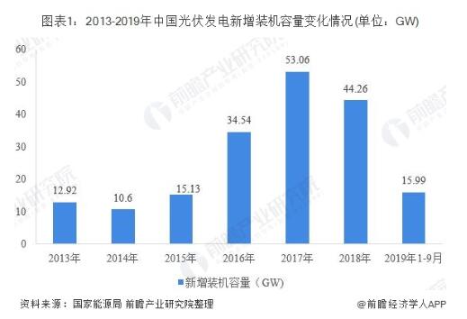 我國太陽能光伏行業(yè)雖起步較晚,但發(fā)展迅速,尤其是2013年以來,在國家及各地區(qū)的政策驅動下,太陽能光伏發(fā)電在我國呈現(xiàn)爆發(fā)式增長,據(jù)國家能源局統(tǒng)計數(shù)據(jù)顯示,2017年,我國光伏發(fā)電新增裝機容量為53.06GW,創(chuàng)歷史新高,2018年,受光伏531新政影響,各地光伏發(fā)電新增項目有所下滑,全年新增裝機容量為44.26GW,同比下降16.6%。截至2019年9月底,全國光伏發(fā)電新增裝機15.99GW。