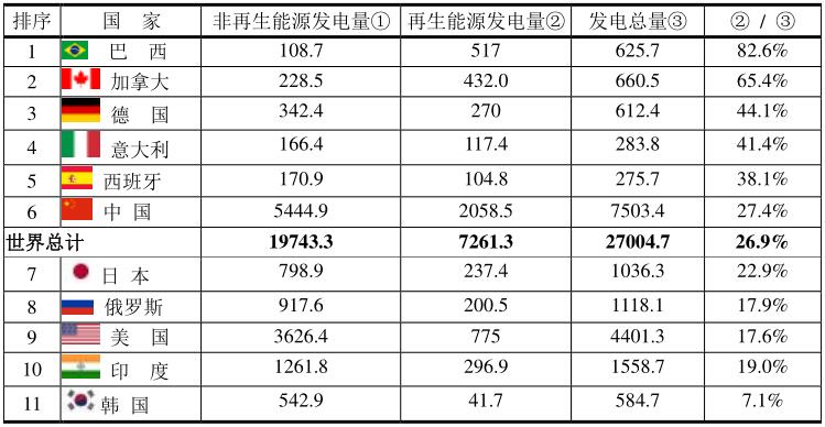 根據(jù)BP 2020年的報告,2019年全球再生能源發(fā)電量7261.3 TWh占全球總發(fā)電量27004.7TWh的平均數(shù)為26.9%。超過平均數(shù)的國家有個特點:水力發(fā)電特別多的國家如巴西、加拿大;利用風(fēng)力發(fā)電和光伏特別多的國家如意大利、西班牙、德國等,而富產(chǎn)化石燃料的國家如美國、俄羅斯就比較低。