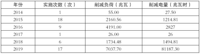 在需求響應(yīng)實施早期,實施目的主要是為了應(yīng)對夏季高峰時段電力消費緊張狀況,最大程度削減高峰電力負荷對電網(wǎng)安全的影響,保障了民生用電和重點用電安全平穩(wěn)。2014~2019年度國內(nèi)開展削峰需求響應(yīng)的情況如下表所示。