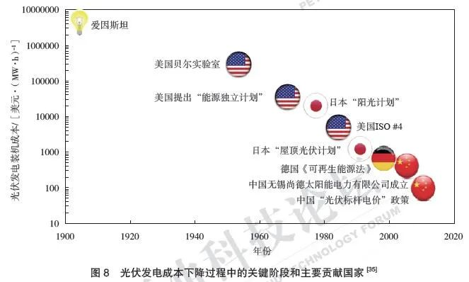 美國(guó)能源技術(shù)和公共政策學(xué)者Gregory F. Nemet于2019年出版著作《光伏如何變得便宜》(How Solar Became Cheap),書中介紹了光伏發(fā)電技術(shù)在歷史上的不同發(fā)展階段、成本變化的關(guān)鍵驅(qū)動(dòng)因素、關(guān)鍵國(guó)家對(duì)成本降低的貢獻(xiàn),以及光伏發(fā)電對(duì)其他低碳能源技術(shù)發(fā)展的經(jīng)驗(yàn)?zāi)P汀9夥l(fā)電的4個(gè)關(guān)鍵階段為:(1)20世紀(jì)50—70年代美國(guó)早期實(shí)驗(yàn)室研究,推動(dòng)每兆瓦時(shí)的裝機(jī)成本從10萬美元級(jí)降到1萬美元級(jí);(2)20世紀(jì)90年代的日本“屋頂光伏計(jì)劃”,推動(dòng)每兆瓦時(shí)裝機(jī)成本降至1000美元級(jí);(3)21世紀(jì)初德國(guó)《可再生能源法》的發(fā)布實(shí)施,推動(dòng)裝機(jī)成本降至1000美元/(MW·h)以下;(4)中國(guó)以“光伏標(biāo)桿電價(jià)”等強(qiáng)力政策推動(dòng)產(chǎn)業(yè)發(fā)展,促進(jìn)裝機(jī)成本降至100美元/(MW·h)以內(nèi)(圖8)。