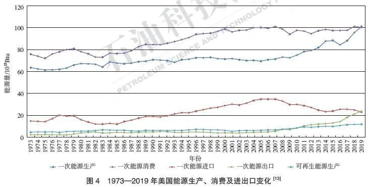 與歐洲的高比例可再生能源、激進(jìn)的碳減排目標(biāo)政策不同,美國(guó)能源轉(zhuǎn)型是在實(shí)現(xiàn)“能源獨(dú)立”的前提下推動(dòng)能源系統(tǒng)清潔化,以增加清潔能源(包括核電、可再生能源、天然氣和潔凈煤等)應(yīng)用比例為主要手段。2000年,美國(guó)和德國(guó)化石能源占一次能源消費(fèi)總量的比例分別是85%和88. 6%,從這一角度來看兩國(guó)能源轉(zhuǎn)型起點(diǎn)相似;2018年,美國(guó)和德國(guó)可再生能源在一次能源消費(fèi)量中所占比例分別為11.4%和16.6%,德國(guó)略勝一籌??v觀1973年以來美國(guó)的能源生產(chǎn)、消費(fèi)和進(jìn)出口情況,自2005年起,美國(guó)可再生能源和核電產(chǎn)量快速增長(zhǎng),清潔能源消費(fèi)比例加速上升;2010以來,一次能源產(chǎn)量快速增長(zhǎng),并在2019年實(shí)現(xiàn)了“能源獨(dú)立”(圖4)。