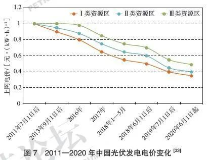 近年來,在全球可再生能源成本迅速下降的過程中,除了政策支持和技術(shù)進(jìn)步以外,產(chǎn)業(yè)規(guī)模經(jīng)濟(jì)和規(guī)模效益是不容忽視的重要推力。中國(guó)得益于較為完備的基礎(chǔ)工業(yè)體系和龐大的市場(chǎng),在推動(dòng)風(fēng)電、光伏發(fā)電、生物質(zhì)發(fā)電、動(dòng)力電池、氫能利用等產(chǎn)業(yè)發(fā)展過程中,發(fā)揮了巨大的規(guī)模經(jīng)濟(jì)優(yōu)勢(shì)。2013年以來,在國(guó)家政策的大力支持下,中國(guó)光伏發(fā)電產(chǎn)業(yè)不斷擴(kuò)大規(guī)模,迅速發(fā)展為全球最大的市場(chǎng),同時(shí)也擺脫了困擾光伏產(chǎn)業(yè)多年的“兩頭在外”的尷尬局面。2013—2018年,中國(guó)光伏裝機(jī)容量達(dá)到1.74×108kW,年復(fù)合增長(zhǎng)率超過73%,較2012年的0.065×108kW增長(zhǎng)26 倍。光伏發(fā)電上網(wǎng)電價(jià)從2011年的1元/(kW·h),下降到2020年的0.35~0.49 元/(kW·h)(2020年6月1日開始實(shí)施)(圖7)。在這一過程中,國(guó)內(nèi)涌現(xiàn)出一批優(yōu)秀的光伏企業(yè),在2019全球光伏企業(yè)20強(qiáng)排行榜上有16家中國(guó)公司,前10名中有7家中國(guó)公司。