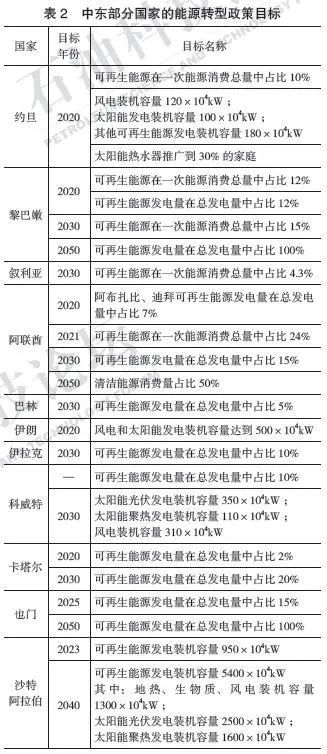 21世紀(jì)以來,全球能源格局發(fā)生重大變化,以美國(guó)頁巖氣革命為代表的非常規(guī)油氣開采量爆發(fā)式增長(zhǎng),可再生能源產(chǎn)業(yè)高速發(fā)展,全球能源消費(fèi)中心不斷向發(fā)展中國(guó)家轉(zhuǎn)移。這些因素促使中東國(guó)家對(duì)后石油時(shí)代進(jìn)行戰(zhàn)略思考。近年來,推進(jìn)能源轉(zhuǎn)型、擴(kuò)大可再生能源應(yīng)用比例逐步進(jìn)入政府部門的視野,沙特阿拉伯、阿聯(lián)酋、卡塔爾、科威特等國(guó)相繼制定了多項(xiàng)政策目標(biāo)(表2)。