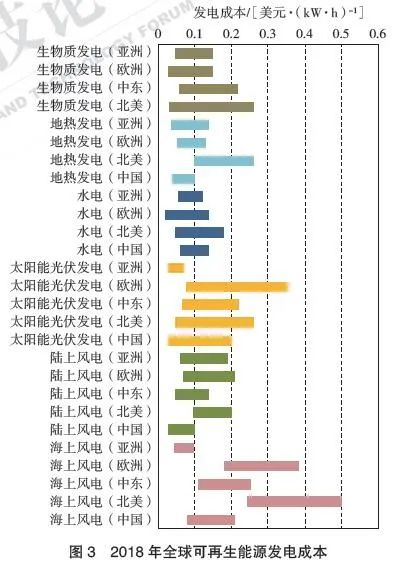 第三,可再生能源大規(guī)模開發(fā)利用。風(fēng)力發(fā)電和太陽能光伏發(fā)電成為全球成本下降最快、平均成本最低的可再生能源發(fā)電方式。2018年,除海上風(fēng)電以外,全球各地多種可再生能源發(fā)電技術(shù)的成本開始具備較強(qiáng)的成本競(jìng)爭(zhēng)力(圖3)。在許多國(guó)家和地區(qū),可再生能源已開始了對(duì)化石能源發(fā)電的存量替代。中國(guó)是世界上可再生能源利用規(guī)模最大、平均成本最低的國(guó)家,從2014年開始,每年的風(fēng)電和太陽能發(fā)電量均超過全社會(huì)新增用電量。