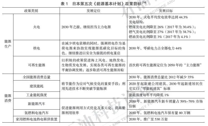 日本能源消費(fèi)高度依賴進(jìn)口,能源自給率低于10%,是發(fā)達(dá)國(guó)家中能源自給率最低的國(guó)家之一。日本能源轉(zhuǎn)型戰(zhàn)略的主要思路不拘泥于能源自給率,著力通過能源技術(shù)優(yōu)勢(shì)彌補(bǔ)資源稟賦的劣勢(shì),將能源技術(shù)能力作為保障能源安全、穩(wěn)定能源供給、優(yōu)化能源結(jié)構(gòu)和提高產(chǎn)業(yè)競(jìng)爭(zhēng)力的戰(zhàn)略性手段。2018年,日本發(fā)布了第五次《能源基本計(jì)劃》,提出了能源轉(zhuǎn)型戰(zhàn)略的新目標(biāo)、新路徑和新方向(表1)。
