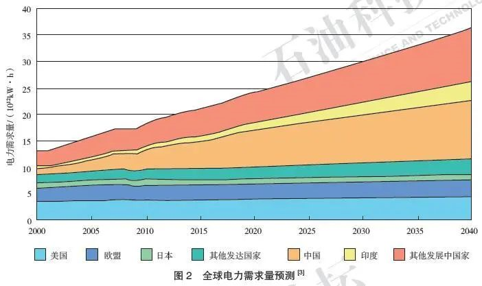 第二,現(xiàn)有能源利用系統(tǒng)變革,電力、氫能等二次能源消費(fèi)規(guī)模不斷擴(kuò)大。電力在終端能源消耗中所占的比例已從2000年的16%,增長(zhǎng)到2018年的20%。國(guó)際可再生能源署(IRENA)認(rèn)為,全球電力需求量將持續(xù)高速增長(zhǎng),2050年,電力在終端能源消費(fèi)中所占比例將提高到49%左右。國(guó)際能源署認(rèn)為,全球電力需求的增長(zhǎng)在發(fā)達(dá)國(guó)家和發(fā)展中國(guó)家將表現(xiàn)出兩條截然不同的路徑:在發(fā)達(dá)國(guó)家,電力需求增長(zhǎng)將被數(shù)字化和電氣化技術(shù)進(jìn)步帶來的能效全面提升所抵消;在發(fā)展中國(guó)家,家庭收入的增長(zhǎng)、工業(yè)規(guī)模的擴(kuò)大和服務(wù)業(yè)的發(fā)展正在有力地推動(dòng)電力需求增長(zhǎng),按照既定政策,預(yù)計(jì)2019—2040年,發(fā)展中國(guó)家對(duì)全球電力需求增長(zhǎng)的貢獻(xiàn)接近90%(圖2)。