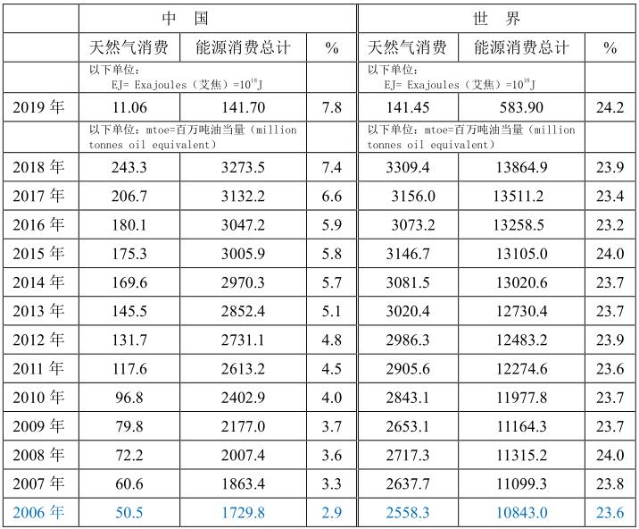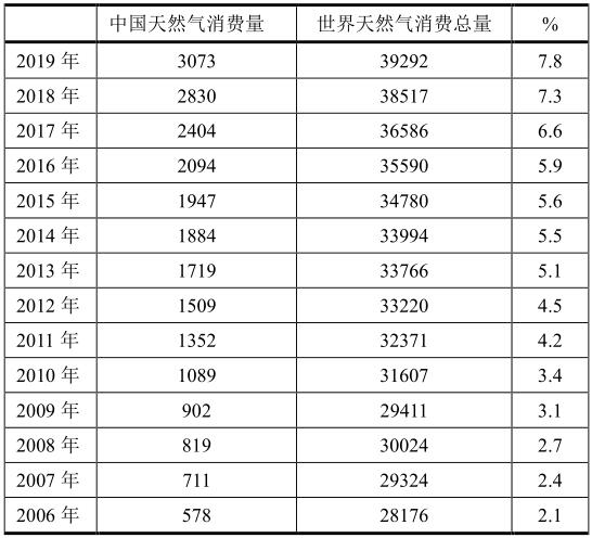 天然氣消費量是指本國天然氣產(chǎn)量和進口量之和。中國于2006年開始LNG國際貿(mào)易,2010年管輸國際貿(mào)易開始,因此從下表可以看出,2006年中國天然氣剛開始進口,消費量僅占世界天然氣消費總量的2.1%,但隨著LNG和管輸國際貿(mào)易以來,中國天然氣消費量僅占世界天然氣消費總量的比例(%)逐年增加,到2019年中國天然氣消費占世界消費總量的比例已經(jīng)達到7.8%。