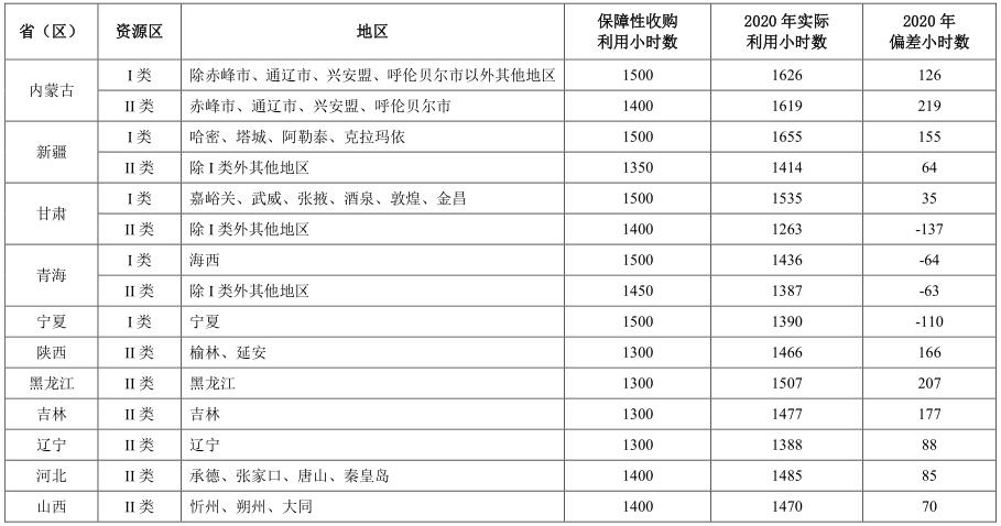 2020年,在規(guī)定風電最低保障收購年利用小時數(shù)的地區(qū)中,甘肅III類資源區(qū)、寧夏III類資源區(qū)和山西IV類資源區(qū)未達國家最低保障收購年利用小時數(shù)要求,實際利用小時數(shù)比最低保障收購年利用小時數(shù)分別低162小時、197小時和150小時。2020年,在規(guī)定光伏發(fā)電最低保障收購年利用小時數(shù)的地區(qū)中,甘肅II類地區(qū)、青海I類和II類地區(qū)以及寧夏I類地區(qū)等4個地區(qū)未達到光伏發(fā)電最低保障收購年利用小時數(shù)要求,其中,甘肅II類地區(qū)比最低保障收購年利用小時數(shù)地區(qū)低137小時;青海I類和II類地區(qū)比最低保障收購年利用小時數(shù)分別低64小時和63小時;寧夏I類地區(qū)比最低保障收購年利用小時數(shù)低110小時。