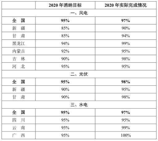 根據(jù)2018年國家發(fā)展改革委、國家能源局印發(fā)的《清潔能源消納行動計劃(2018-2020年)》(發(fā)改能源規(guī)〔2018〕1575號),所確定的分年度風電、光伏和水電消納目標,2020年全國平均風電利用率97%,超過2020年風電利用率目標2個百分點,重點省區(qū)全部達到了2020年消納目標;全國平均光伏發(fā)電利用率為98%,超過2020年利用率目標3個百分點,重點省區(qū)全部達到了2020年消納目標;全國主要流域水能利用率97%,超過2020年利用率目標近2個百分點,重點省區(qū)全部達到了2020年消納目標。