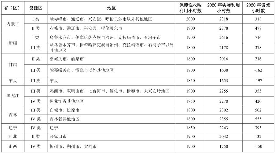 表3 2020年風電重點地區(qū)最低保障收購年利用小時數(shù)落實情況
