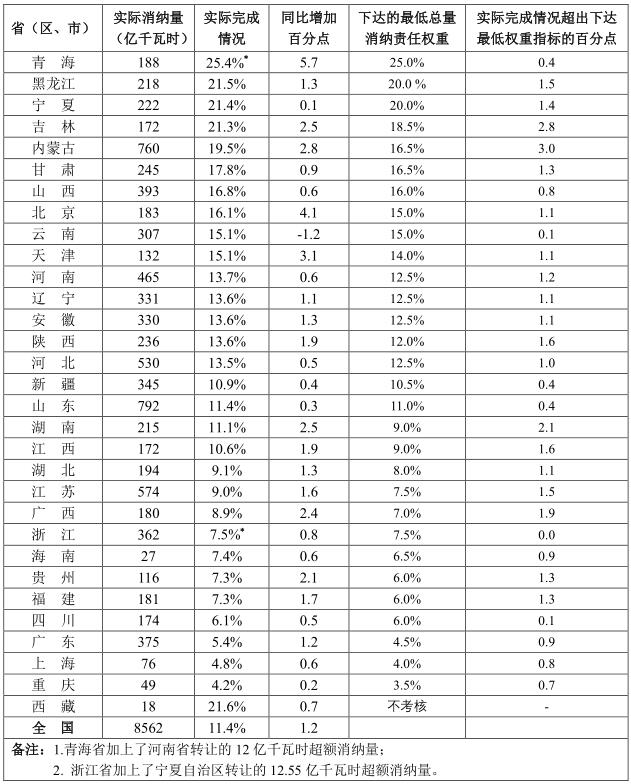 二、各省(區(qū)、市)可再生能源電力消納責任權重完成情況