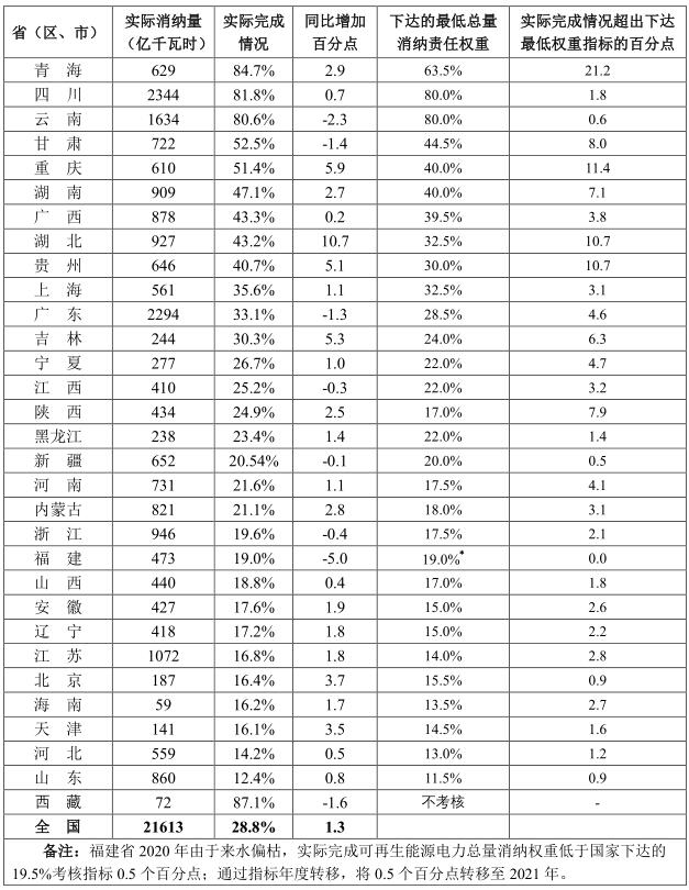 根據(jù)《國家發(fā)展改革委 國家能源局關于印發(fā)各省級行政區(qū)域2020年可再生能源電力消納責任權重的通知》(發(fā)改能源〔2020〕767號)公布的2020年各省(區(qū)、市)可再生能源電力消納責任權重,綜合考慮各省本地生產、本地利用以及外來電力消納情況,經核算,除西藏免除考核外,全國30個省(區(qū)、市)都完成了國家能源主管部門下達的總量消納責任權重和非水電消納責任權重。