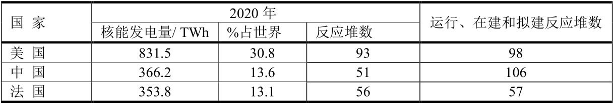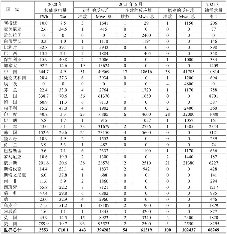 表中“%e”表示核能發(fā)電占發(fā)電總量的百分率。全球核能發(fā)電占全球發(fā)電總量的10.1%,其中法國高達(dá)70.6%。本數(shù)據(jù)是世界核能協(xié)會WNA 2021年1月份提供的數(shù)據(jù)。