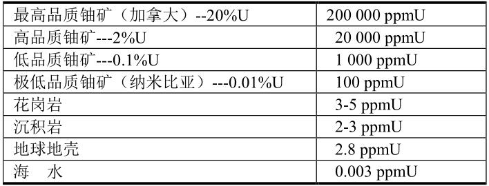 鈾在土壤、巖石及河流、海洋都可發(fā)現(xiàn);甚至在人體和食品中都有痕跡量存在。但是濃縮的鈾礦卻只在很少的地方發(fā)現(xiàn),一般是在堅硬的巖石中,如在地殼中占60%的花崗巖中,其鈾含量可達(dá)百萬分之四。