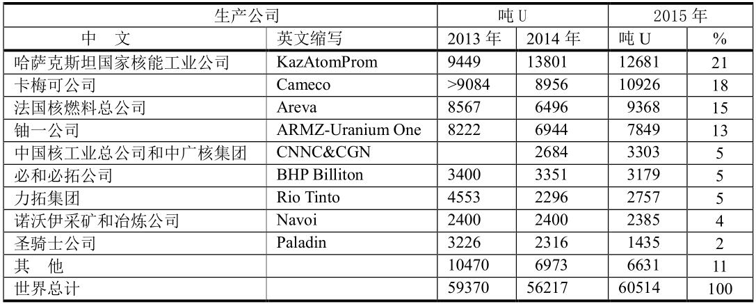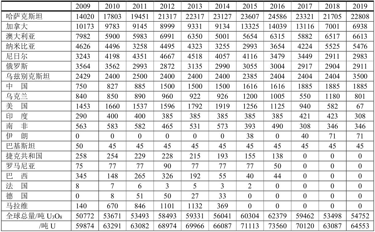 本數(shù)據(jù)是世界核能協(xié)會(WNA)于 2020年12月份提供的從鈾礦生產(chǎn)(公噸U)的數(shù)據(jù)。
