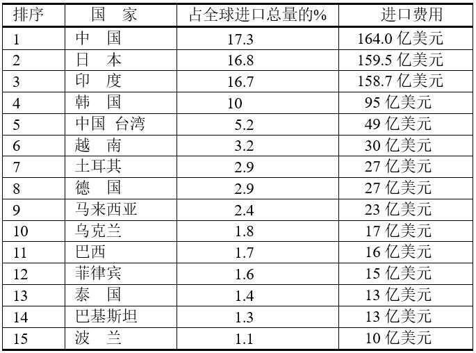 2020年原煤的國(guó)際貿(mào)易量為12.46億噸。煤進(jìn)口前15位國(guó)家和地區(qū)的數(shù)量約占全球總量的86.3%,為10.75億噸。其中最大的煤進(jìn)口國(guó)是中國(guó),占全球總量的17.3%,其次是日本(16.8%)和印度(16.7%)。