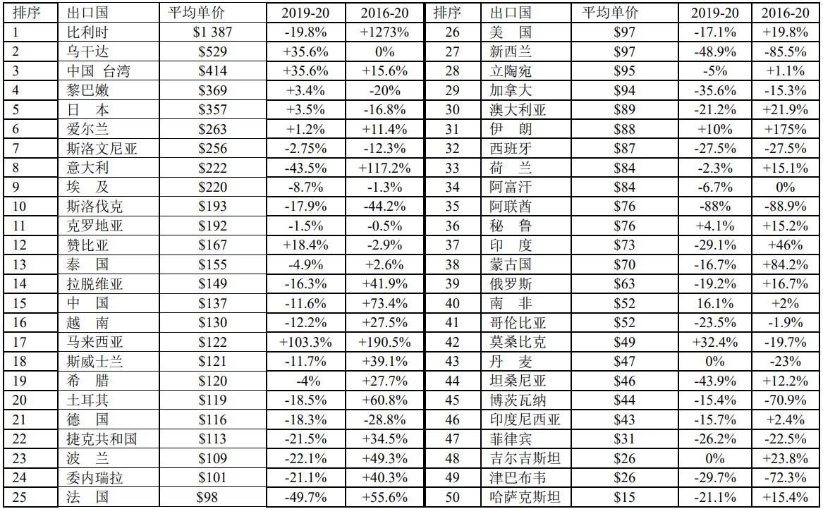 2019年至2020年,平均單價(jià)增長(zhǎng)最快的國(guó)家是馬來西亞(增長(zhǎng)103.3%)、烏干達(dá)(增長(zhǎng)35.6%)、莫桑比克(增長(zhǎng)32.4%)、贊比亞(增長(zhǎng)18.4%)和伊朗(增長(zhǎng)10%)。
