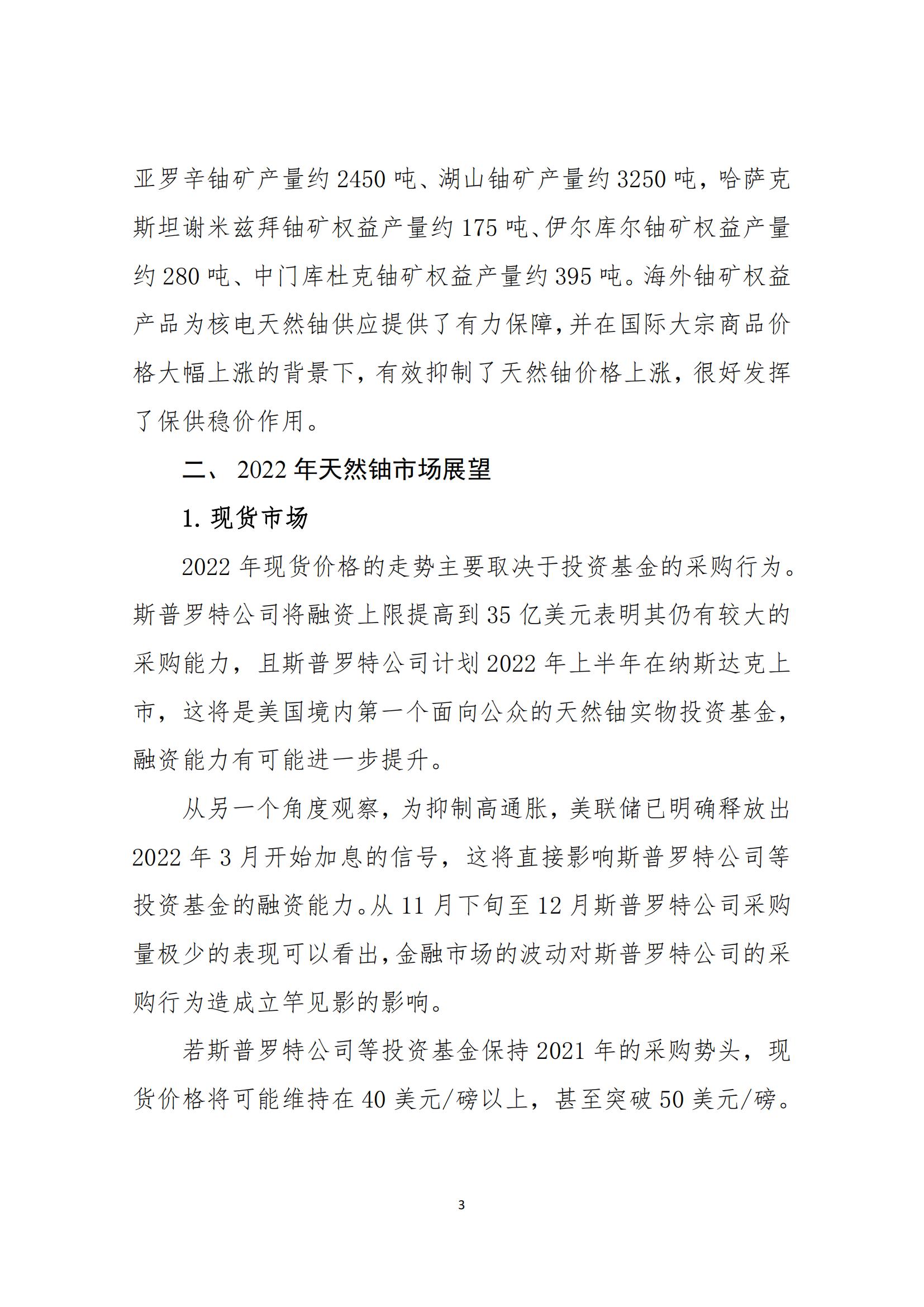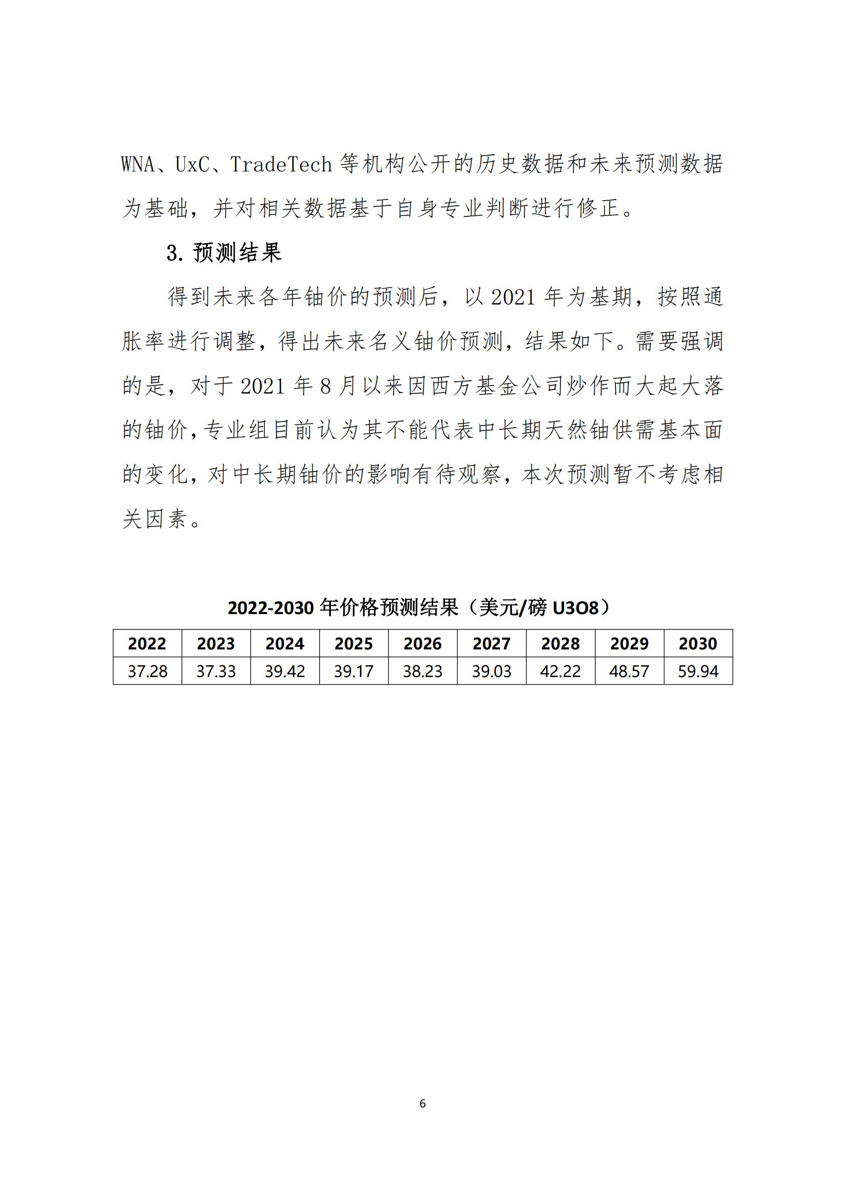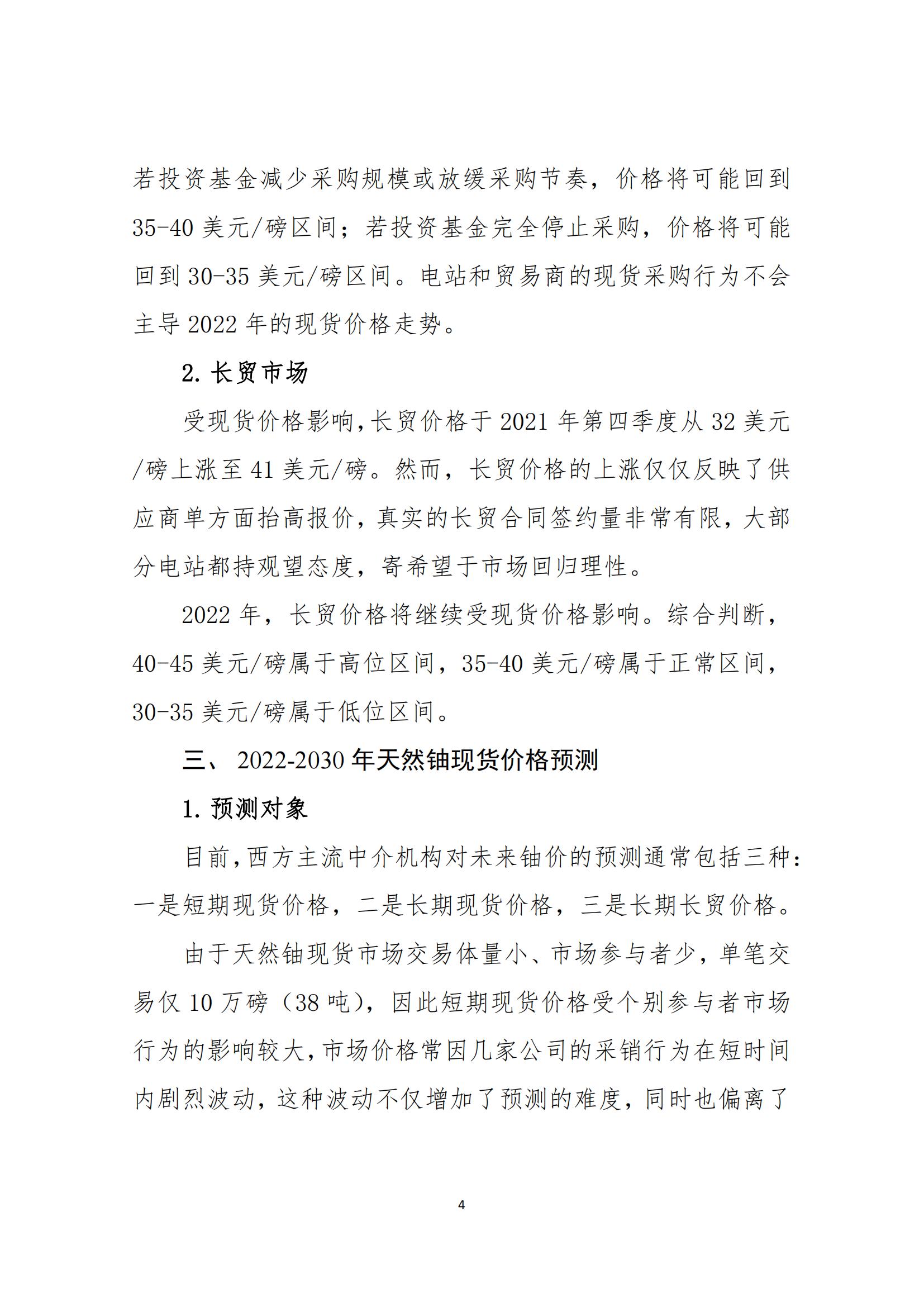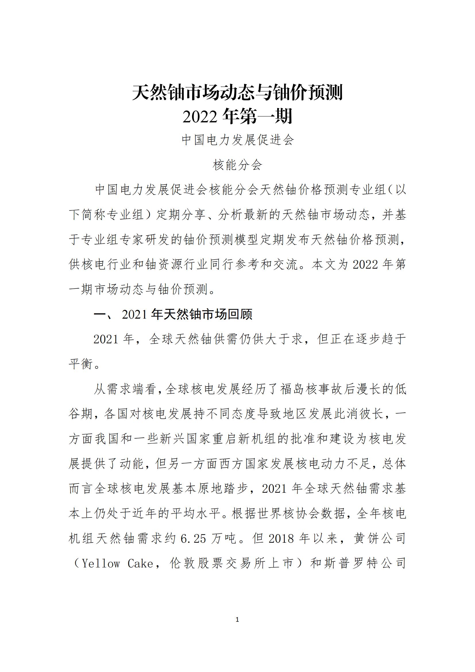 2022年2月7日,虎年春節(jié)后第一個(gè)工作日,由中國(guó)電力發(fā)展促進(jìn)會(huì)核能分會(huì)編制的2022年第一期天然鈾價(jià)格預(yù)測(cè)報(bào)告發(fā)布,電力網(wǎng)獲悉,今后報(bào)告將每季度發(fā)布一次,一年四期。