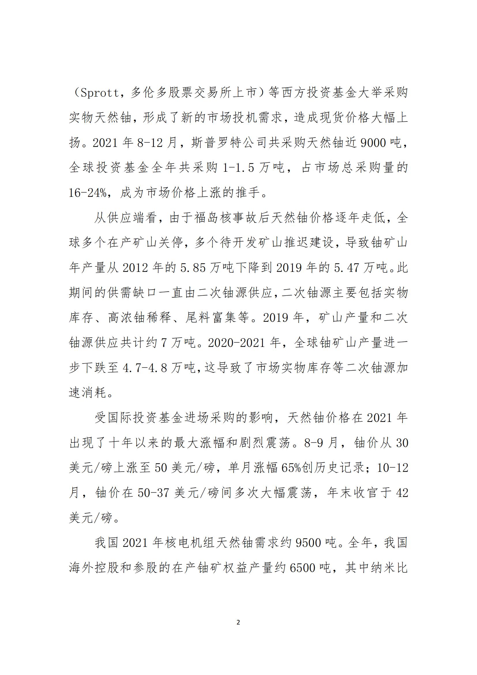 報(bào)告認(rèn)為,2021年的全球天然鈾市場(chǎng),仍供大于求,但正逐步趨于平衡。值得注意的是,2018年以來(lái),黃餅公司(Yellow Cake,倫敦股票交易所上市)和斯普羅特公司(Sprott,多倫多股票交易所上市)等西方投資基金大舉采購(gòu)實(shí)物天然鈾,形成了新的市場(chǎng)投機(jī)需求,造成現(xiàn)貨價(jià)格大幅上揚(yáng)。8-9月,鈾價(jià)從30美元/磅上漲至50美元/磅,單月漲幅65%創(chuàng)歷史記錄;10-12月,鈾價(jià)在50-37美元/磅間多次大幅震蕩,年末收官于42美元/磅。我國(guó)海外鈾礦權(quán)益產(chǎn)品為核電天然鈾供應(yīng)提供了有力保障,并在國(guó)際大宗商品價(jià)格大幅上漲的背景下,有效抑制了天然鈾價(jià)格上漲,很好地發(fā)揮了保供穩(wěn)價(jià)作用。