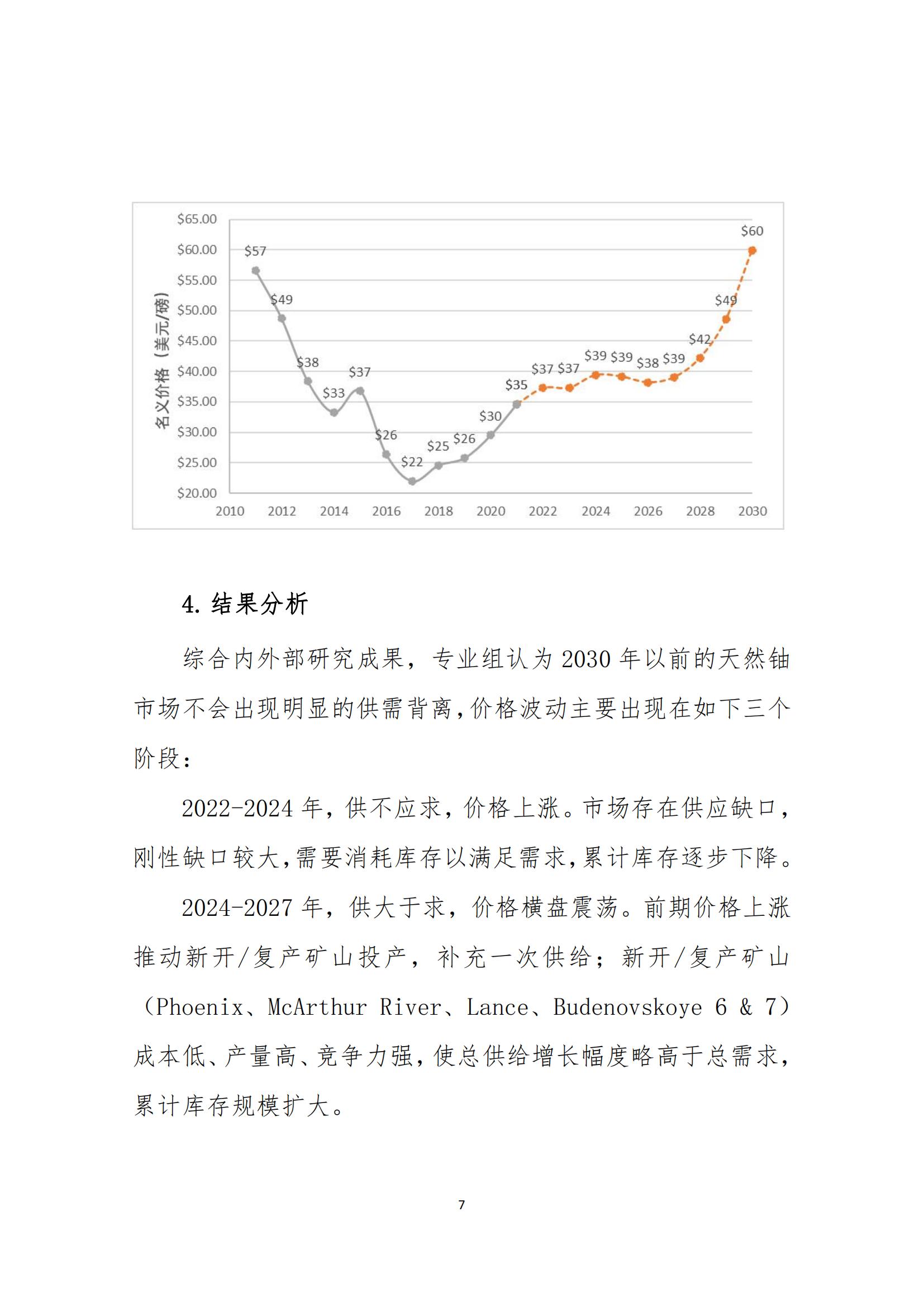 報(bào)告還對(duì)2022-2030年天然鈾現(xiàn)貨價(jià)格作了預(yù)測(cè)。之所以選擇對(duì)長(zhǎng)期現(xiàn)貨價(jià)格進(jìn)行預(yù)測(cè),是因?yàn)樵搩r(jià)格是反應(yīng)市場(chǎng)供需關(guān)系的主要指標(biāo),是長(zhǎng)貿(mào)協(xié)議引用的重要指數(shù),且不易受到短期市場(chǎng)投機(jī)行為的影響。