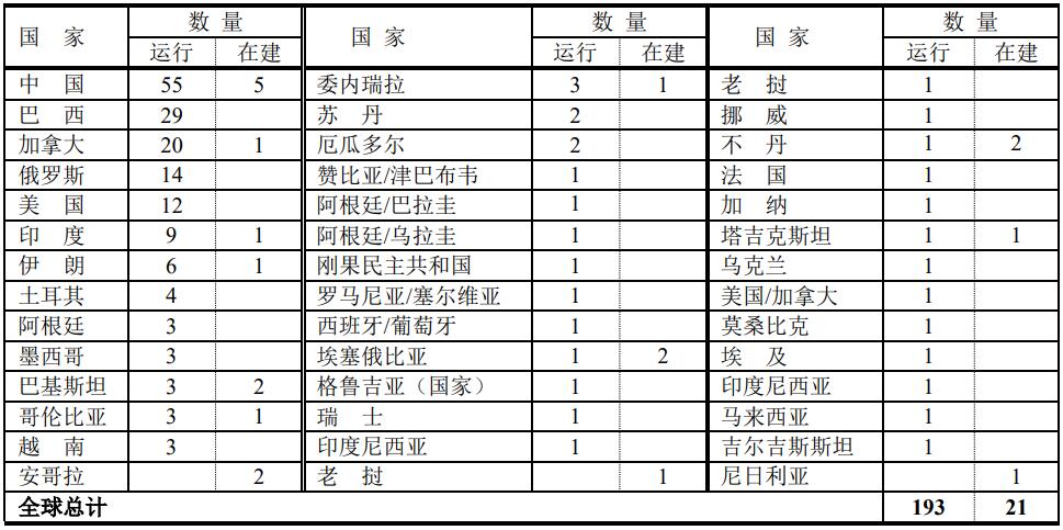 世界各國(guó)裝機(jī)容量在1000MW以上水電站數(shù)