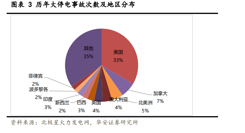新能源發(fā)電設(shè)備在過程中,外部環(huán)境不能確保設(shè)備可以持續(xù)穩(wěn)定發(fā)電,存在一定的 隨機性。儲能系統(tǒng)可以對隨機性、間歇性和波動性的可再生能源發(fā)電出力進行平滑控制, 從源頭降低波動性,滿足可再生能源并網(wǎng)要求,為未來大規(guī)模發(fā)展應(yīng)用打好基礎(chǔ)。全球 范圍內(nèi)具有突發(fā)性、影響范圍超過 10 萬人、停電時長>1h 的大停電事故屢屢發(fā)生,美 國、加拿大、澳大利亞、巴西、印度等國家大停電事故發(fā)生次數(shù)最多,普遍具有國土面 積遼闊、供電跨度大、電力運行工況復(fù)雜的特點。北美電網(wǎng)系統(tǒng)設(shè)施老舊,亞非拉地區(qū) 缺乏強大電力設(shè)施建設(shè)投入,導(dǎo)致斷電、缺電現(xiàn)象頻發(fā),疊加氣候變暖、寒潮、龍卷風(fēng)、 高溫干旱等極端氣候多發(fā),當(dāng)?shù)鼐用駥o急備電需求屬于剛需。戶用家儲在電廠事故或 者極端自然災(zāi)害事件中提供應(yīng)急電源,提高用電穩(wěn)定性。全球分布式光伏和戶用家儲仍 處于低水平起步階段,大部分地區(qū)光儲滲透率在 10%以下,發(fā)展空間大。
