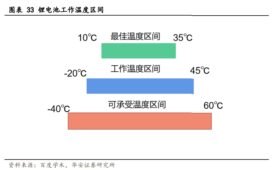 溫控是指通過加熱或冷卻技術對電池的溫度進行有效控制和調節(jié)的過程。溫控系統(tǒng) 與電池管理系統(tǒng)配合,對鋰電池進行恒溫控制,使其維持在安全的參數范圍內,避免電 池進入熱失控狀態(tài)。鋰電池安全性、容量衰減受溫度影響較大。根據研究表明,鋰電池 最佳溫度區(qū)間為 10-35℃,過度的高低溫都會對鋰電池壽命和安全性產生影響。
