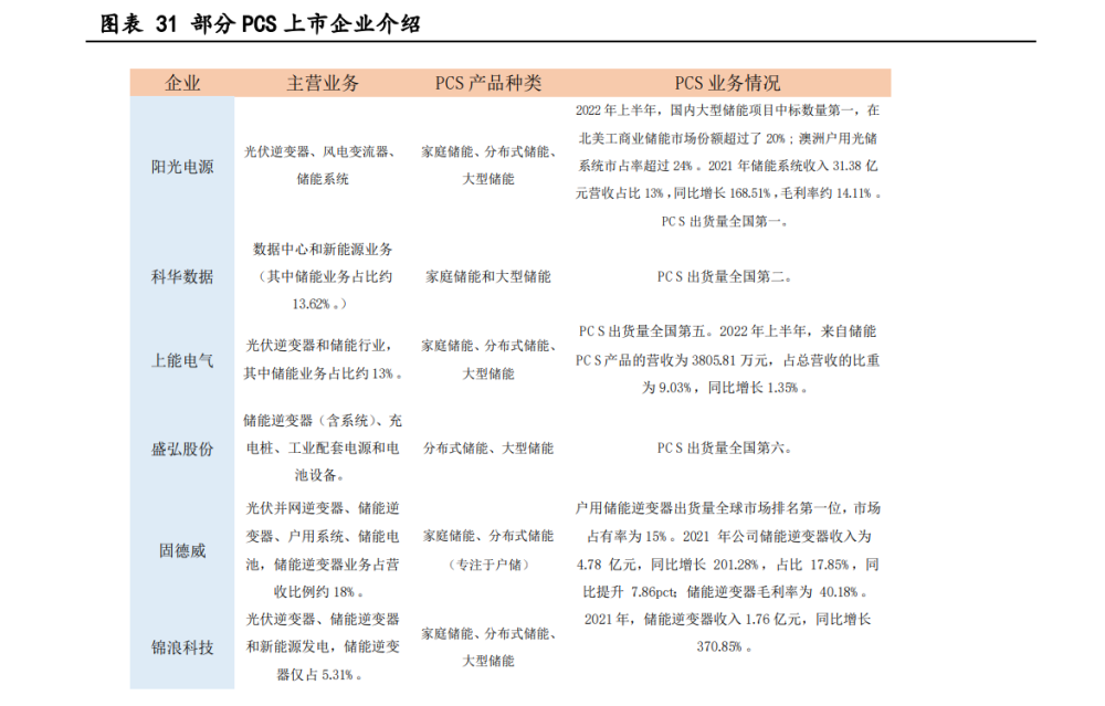 2021 年,中國新增投運的電化學儲能項目中,裝機規(guī)模排名前十位的儲能逆變器提 供商,依次為:上能電氣、科華數能、索英電氣、南瑞繼保、陽光電源、盛弘股份、華 自科技、智光儲能、匯川技術和許繼。 目前從事逆變器的上市企業(yè)主要有上能電氣、固德威和錦浪科技等。從產品結構來 看,上能電氣、固德威以光伏逆變器為主,錦浪科技以組串式逆變器為主。從營收來看, 錦浪科技營收位于行業(yè)較高水平,2021 年為 33.12 億元。從營收增速看,固德威成長較 快,2021 年營收增速達 68.53%,毛利率達到 31.7%,凈利率達 10.4%。隨著國內逆變器 企業(yè)快速發(fā)展,國產逆變器在海外的競爭優(yōu)勢凸顯。受到國內市場政策波動影響,尤其 是 2018 年 531 新政后,國內逆變器企業(yè)加快拓展海外渠道,加速海外布局。2021 年, 全球逆變器出貨量前十大公司中中國企業(yè)獨占 6 席,其中華為、陽光電源逆變器出貨量 分列全球第一、第二,分別為 52GW 和近 48GW,第三名為海外公司,其出貨量為 15GW 左 右,與華為、陽光電源存在較大差距。