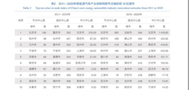 北京市、上海市和其他省會(huì)城市、首府城市是中國(guó)新能源汽車產(chǎn)業(yè)創(chuàng)新網(wǎng)絡(luò)中的核心節(jié)點(diǎn),并具有引導(dǎo)其他城市共同開展新能源汽車專利合作的能力。由表2可知,北京市節(jié)點(diǎn)中心度自2011年以來始終是中國(guó)新能源汽車產(chǎn)業(yè)創(chuàng)新網(wǎng)絡(luò)中各城市的最高值,并且遠(yuǎn)高于其他城市。這反映出北京市不僅在數(shù)量上擁有最多的新能源汽車產(chǎn)業(yè)專利,同時(shí)相對(duì)于其他城市,還與創(chuàng)新網(wǎng)絡(luò)中更多其他的節(jié)點(diǎn)城市開展了新能源汽車的創(chuàng)新合作。北京市在中介中心度上自2011年以來也保持著遠(yuǎn)高于其他節(jié)點(diǎn)城市的數(shù)值。這反映了在新能源汽車產(chǎn)業(yè)創(chuàng)新網(wǎng)絡(luò)中,北京市擁有遠(yuǎn)高于其他城市的在聯(lián)合其他兩個(gè)及兩個(gè)以上城市共同開展研發(fā)活動(dòng)的能力。上海市的節(jié)點(diǎn)中心度和中介中心度自2011年以來上升顯著。同時(shí),杭州市和南京市等其他長(zhǎng)江三角洲城市群地區(qū)的城市也具有較高的節(jié)點(diǎn)中心度和中介中心度。結(jié)合圖1可知,在長(zhǎng)江三角洲城市群地區(qū),上海市同其他城市已經(jīng)形成了復(fù)雜的新能源汽車產(chǎn)業(yè)創(chuàng)新網(wǎng)絡(luò),同樣具有聯(lián)合其他兩個(gè)及兩個(gè)以上城市共同開展研發(fā)活動(dòng)的能力。此外,相較于2011—2015年,2016—2020年的節(jié)點(diǎn)中心度和中介中心度排名前10名的城市中省會(huì)城市和首府城市顯著增多,這是由于省會(huì)城市和首府城市在省內(nèi)和自治區(qū)內(nèi)通常擁有更多的政策傾斜和更為豐富的企業(yè)、科研資源。隨著參與到中國(guó)新能源汽車產(chǎn)業(yè)創(chuàng)新網(wǎng)絡(luò)中的城市逐漸增多,省會(huì)城市和首府城市更有能力與率先開展新能源汽車研發(fā)的城市開展合作,或者自主開展并引導(dǎo)其他鄰近城市參與新能源汽車的研發(fā)活動(dòng)。