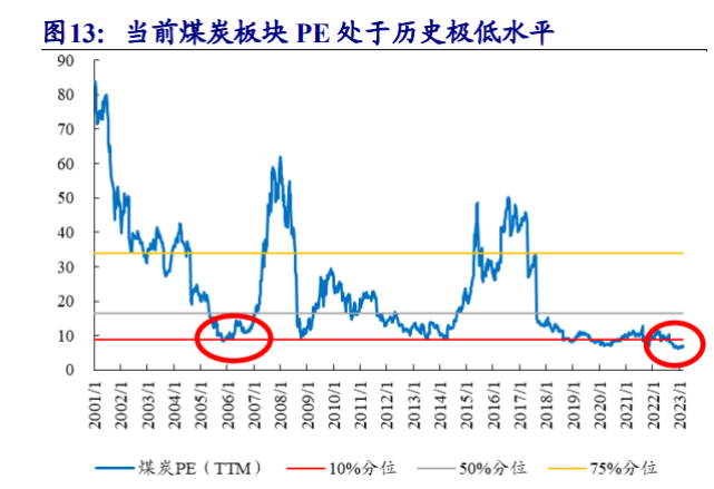 煤炭板塊PE處于歷史極低位。截至2023年3月10日,煤炭板塊市盈率PE(TTM)為6.70倍,遠(yuǎn)低于歷史估值10%分位。歷史上,煤炭板塊PE低位出現(xiàn)在2005年,2008年,2014年及2020年。2005年12月,煤炭板塊PE階段性低點(diǎn)為8.35倍,比當(dāng)前PE高24.6%。2008年10月,煤炭板塊PE階段性低點(diǎn)為9.41倍,比當(dāng)期PE高40.4%。2014年3月,煤炭板塊PE階段性低點(diǎn)為9.07倍,比當(dāng)期PE高35.4%。2020年3月23日,煤炭板塊PE階段性低點(diǎn)為7.09倍,比當(dāng)期PE高5.8%。從基本面看,2005年煤炭行業(yè)盈利向好,煤價(jià)經(jīng)歷2004年的上漲后維持高位,PE低位主因股市整體低迷;2014年煤炭供給嚴(yán)重過剩,煤企利潤大幅下滑,虧損面擴(kuò)大,盈利下降導(dǎo)致PE低位;2020年疫情突發(fā),股市大幅波動(dòng),煤炭板塊出現(xiàn)PE低點(diǎn)。從歷史PE看,2005年、2008年、2013-2014年、2020年,煤炭板塊PE都出現(xiàn)相對(duì)低點(diǎn),2008年主因金融危機(jī),股市出現(xiàn)大幅波動(dòng),2013年-2014年煤炭行業(yè)進(jìn)入低谷,低盈利導(dǎo)致低PE,2020年主因突發(fā)疫情,能源價(jià)格出現(xiàn)大跌。但相比于行業(yè)低谷于突發(fā)事件期間,當(dāng)前煤炭板塊高盈利、低PE,基本面更接近于2005年的高盈利時(shí)期,但PE仍遠(yuǎn)低于當(dāng)時(shí)低點(diǎn)。當(dāng)前煤炭板塊PE已處于歷史區(qū)間谷底,主因2021年以來煤炭板塊業(yè)績持續(xù)增長,而煤炭板塊價(jià)值被嚴(yán)重低估。