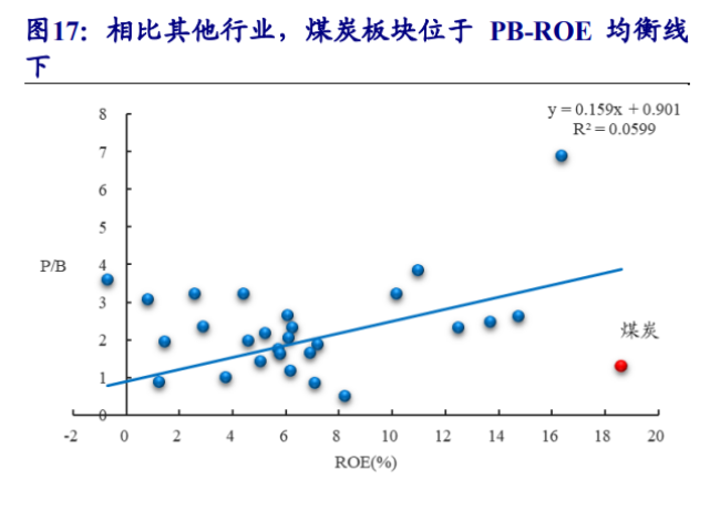 2.3、從PB-ROE看,煤炭行業(yè)估值明顯折價(jià)
