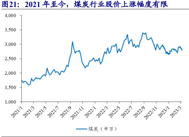 股價(jià)僅限盈利驅(qū)動(dòng),且市場認(rèn)為高盈利不可持續(xù)。2021-2022年,煤炭板塊較年初分別上漲10.9%和43.6%,2022年12月31日,煤炭板塊較2021年1月4日上漲51.8%。2021年,煤炭上市公司歸母凈利1600億元,同比增長75.6%,2022年前三季度,煤炭上市公司歸母凈利2058億元,同比增長71.3%。煤炭板塊上漲僅限盈利驅(qū)動(dòng),估值尚未提升,且煤炭板塊股價(jià)上漲幅度遠(yuǎn)不及煤企利潤增長幅度,市場認(rèn)為煤企高盈利不可持續(xù)。2021-2022年,煤炭板塊股價(jià)上漲主要來自煤企業(yè)績?cè)鲩L,且股價(jià)上漲幅度遠(yuǎn)不及業(yè)績?cè)鲩L幅度,這使煤炭板塊估值持續(xù)低位。但我們也應(yīng)該看到,經(jīng)過多年的發(fā)展,煤炭行業(yè)已不再是高污染的產(chǎn)能過剩行業(yè),能源安全背景下,煤炭作為我國主體能源在短期內(nèi)不會(huì)改變。而“雙碳”政策也限制了煤炭的產(chǎn)能周期,正因?yàn)槊禾烤哂休^高的碳排放,未來產(chǎn)能將變的更為稀缺,煤炭盈利有望維持在高水平,煤炭價(jià)值或?qū)⒈恢鸩桨l(fā)現(xiàn)。