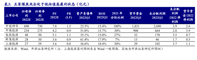 五家煤炭央企具備提估值基礎(chǔ)。煤炭行業(yè)共有五家央企,分別為中國(guó)神華(隸屬國(guó)家能源投資集團(tuán))、中煤能源(隸屬中煤能源集團(tuán))、電投能源(隸屬國(guó)家電力投資集團(tuán))、新集能源(隸屬中煤能源集團(tuán))和上海能源(隸屬中煤能源集團(tuán))。五家煤炭央企中,除中國(guó)神華估值相對(duì)更高外,其他估值普遍較低,中煤能源集團(tuán)旗下三家上市公司市凈率均處于破凈狀態(tài)。從凈資產(chǎn)收益率看,五家煤炭央企2022年前三季度ROE均超過(guò)15%,均處于高盈利狀態(tài)。從貨幣資金和未分配利潤(rùn)看,中國(guó)神華、中煤能源、電投能源均有較多未分配利潤(rùn),具備高分紅基礎(chǔ)。截至2022年三季度,中國(guó)神華未分配利潤(rùn)/2022E凈利潤(rùn)、貨幣資金/2022E凈利潤(rùn)分別為3.9和2.6,未分配利潤(rùn)和貨幣資金均遠(yuǎn)超2022年凈利潤(rùn),2022年或?qū)⒕S持2021年的100%分紅比例,對(duì)應(yīng)當(dāng)前股價(jià),股息率超過(guò)12%,高股息率下,中國(guó)神華仍具備提估值基礎(chǔ)。截至2022年三季度,中煤能源未分配利潤(rùn)/2022E凈利潤(rùn)、貨幣資金/2022E凈利潤(rùn)分別為2.8和3.9,中煤能源在手貨幣資金充裕,2021年分紅比例為30%,2022年存在提高分紅比例的可能,若2022年分紅比例達(dá)到60%,對(duì)應(yīng)當(dāng)前股價(jià),股息率與中國(guó)神華相當(dāng),而其PE/PB估值明顯偏低,且PB已低于1倍,存在大幅提估值可能。截至2022年三季度,電投能源未分配利潤(rùn)/2022E凈利潤(rùn)、貨幣資金/2022E凈利潤(rùn)分別為3.5和0.7,電投能源未分配利潤(rùn)較多,但貨幣資金相對(duì)偏少,主因公司在建綠電項(xiàng)目較多,綠電轉(zhuǎn)型理應(yīng)為公司帶來(lái)更高的估值。