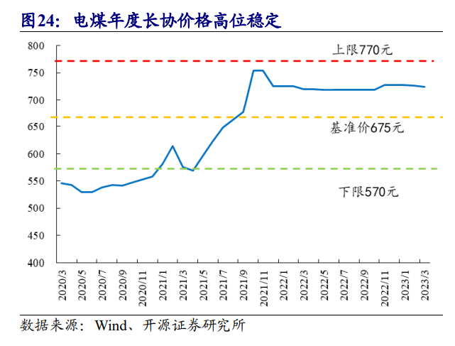 長(zhǎng)協(xié)價(jià)格穩(wěn)定、比例提升—煤企盈利確定—估值重構(gòu)邏輯凸顯。價(jià)格方面,2022年,下水動(dòng)力煤年度長(zhǎng)協(xié)基準(zhǔn)價(jià)按675元/噸執(zhí)行,較2020-2021年的535元/噸大幅提升,2022年,動(dòng)力煤年度長(zhǎng)協(xié)價(jià)格維持在720元/噸附近,動(dòng)力煤年度長(zhǎng)協(xié)價(jià)格高位穩(wěn)定。同時(shí),電煤現(xiàn)貨限價(jià)執(zhí)行1.5倍長(zhǎng)協(xié),港口限價(jià)1155元/噸。2022年,京唐港動(dòng)力煤均價(jià)1273元/噸,全年均價(jià)超過(guò)電煤現(xiàn)貨限價(jià)10.3%,且大幅高于電煤年度長(zhǎng)協(xié)價(jià)格。即使現(xiàn)貨價(jià)格下跌,年度長(zhǎng)協(xié)價(jià)格遠(yuǎn)低于現(xiàn)貨價(jià)格,我們預(yù)計(jì)未來(lái)幾年長(zhǎng)協(xié)價(jià)格亦難有下跌空間,當(dāng)前年度長(zhǎng)協(xié)價(jià)格724元/噸,離上限770元/噸,仍有上漲空間。比例方面:隨著發(fā)改委對(duì)煤炭中長(zhǎng)期合同監(jiān)管工作的重視,2022年電煤中長(zhǎng)期合同比例逐漸提升。晉控電力煤炭年度長(zhǎng)協(xié)比例從2022年Q1的61%提升到2022年Q1-Q3的80%。我們測(cè)算,國(guó)電、華能、華電、大唐四大電力集團(tuán)符合價(jià)格的長(zhǎng)協(xié)比例預(yù)計(jì)從2021年Q4的23%提升至2022年Q4的72%。2022年10月31日,發(fā)改委印發(fā)《2023年電煤中長(zhǎng)期合同簽訂履約工作方案》的通知,要求原則上每個(gè)煤炭企業(yè)電煤中長(zhǎng)期合同任務(wù)量不應(yīng)低于自有資源量的80%,不低于動(dòng)力煤資源量的75%,其中,2021年9月份以來(lái)核增產(chǎn)能的保工煤礦核增部分按承諾要求全部簽訂電煤中長(zhǎng)期合同。2023年,電煤長(zhǎng)協(xié)價(jià)格有望維持高位,長(zhǎng)協(xié)比例預(yù)計(jì)維持2022年Q4水平??紤]到煤炭行業(yè)新的產(chǎn)能周期無(wú)法順利開(kāi)啟,未來(lái)相當(dāng)長(zhǎng)一段時(shí)間內(nèi),煤炭將處于保供穩(wěn)價(jià)狀態(tài),煤炭行業(yè)確定性邏輯從2022年開(kāi)始演繹。長(zhǎng)協(xié)價(jià)格高位穩(wěn)定、比例較高—煤企盈利穩(wěn)定—煤炭股估值重構(gòu)的邏輯非常明顯。