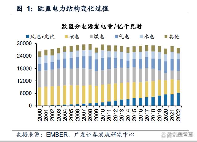 (1)發(fā)電量持穩(wěn),電源相互替代:歐盟整體發(fā)電量在2008年達(dá)到頂峰后回落,2022 年最新發(fā)電量相比20年前并無(wú)太大增量,電力結(jié)構(gòu)的演變更多體現(xiàn)在內(nèi)部各種電源 的相互替代;