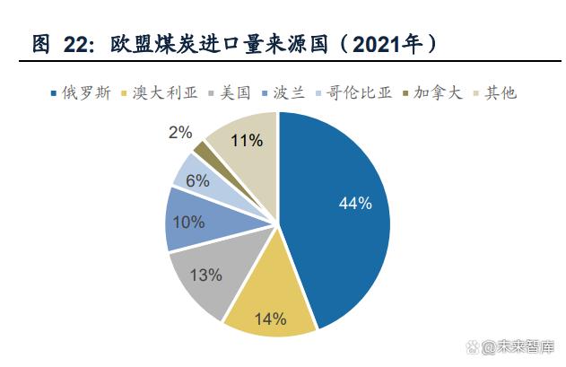 歐盟化石能源進(jìn)口高度依賴俄羅斯,2021年歐盟煤炭、天然氣進(jìn)口量中分別44%、 41%來自俄羅斯,俄烏沖突導(dǎo)致歐洲面臨能源價(jià)格和供應(yīng)的雙重危機(jī)。長遠(yuǎn)來看, 歐盟實(shí)現(xiàn)能源獨(dú)立將從兩方面著手:一是多元化進(jìn)口天然氣氣源,二是加速能源轉(zhuǎn) 型,提高能效,減少對(duì)化石能源的依賴,歐盟對(duì)煤炭的需求或?qū)⒊掷m(xù)下降。 煤炭:歐盟的煤炭供給量逐年下降至2021年的4.87億噸,較2000年的8.31億噸減少 41.4%,同時(shí)同步減少煤炭本土產(chǎn)量和進(jìn)口量,對(duì)外依存度保持在20%~25%。從煤 炭進(jìn)口來源看,歐盟煤炭前三大進(jìn)口國是俄羅斯(占比44%)、澳大利亞(占比14%)、 美國(占比13%);德國和波蘭為本土的產(chǎn)煤大國,合計(jì)產(chǎn)量占?xì)W盟總產(chǎn)量的70%。