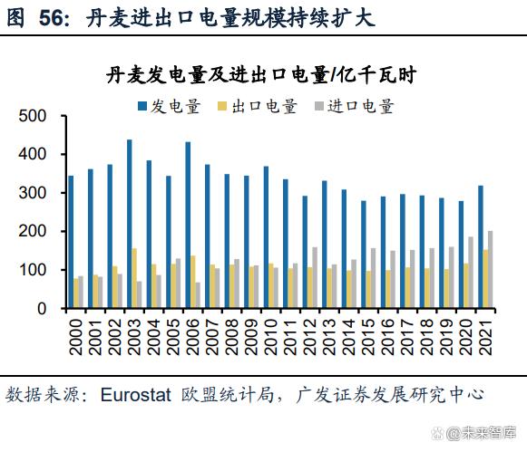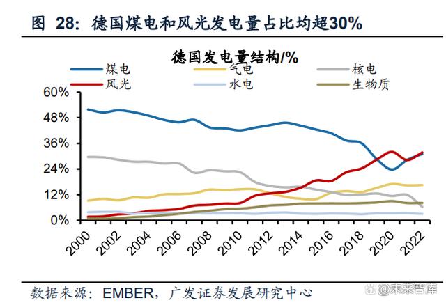 (1)丹麥,以煤為主到以風光為主:2000年煤電發(fā)電量占比超40%,2022年降至 10.5%,風光發(fā)電量占比已超60%,生物質(zhì)發(fā)電占比23%,丹麥主要依靠與鄰國電網(wǎng) 互聯(lián),挪威和瑞典均是水電富余國家,通過電量進出口調(diào)節(jié)國內(nèi)電量消納,所以風 光占比高仍然沒有出現(xiàn)消納問題;