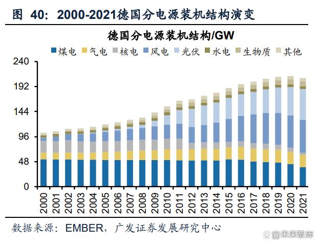 新能源滲透率提升的同時,德國保留一定火電裝機用于調(diào)峰。與丹麥不同,德國在 風光發(fā)電量提升的同時,始終保留一定的煤電、并新增一批氣電裝機解決風光消納 問題,這與德國資源稟賦有關,德國是歐盟最大的煤炭產(chǎn)出國,2021年德國煤炭產(chǎn)量占歐盟的38%,這與我國頗為相似。2000-2021年德國煤電和氣電裝機占比從63.3% 降低至29.2%,風光裝機占比從6.0%提升至58.7%,新增裝機主要由風光貢獻。發(fā)電 量結構來看,2000-2021年德國煤電和氣電發(fā)電量占比從61.0%降低至44.6%,風光 發(fā)電量占比從1.6%提升至28.2%,火電仍然保持了一定比例用于調(diào)峰。