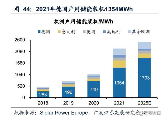德國除保留火電裝機外,還積極發(fā)展儲能。與丹麥不同,德國用電規(guī)模大,風光消 納面臨形勢更嚴峻,除了保留一定規(guī)模的火電裝機外,德國還積極發(fā)展儲能,儲能 規(guī)模排在歐洲國家前列,同時德國電網(wǎng)跨度大,儲能調(diào)度困難,因此重點發(fā)展戶用 儲能,2021年德國戶用儲能占歐洲比例達61%。
