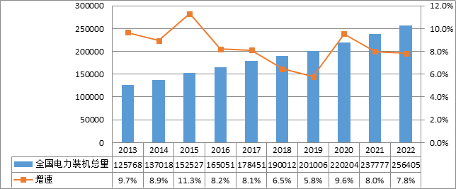 圖3 2013—2022年全國電力裝機及增速情況(單位:萬千瓦)
