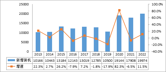 圖6 2013—2022年全國新增電力裝機及增速情況(單位:萬千瓦)