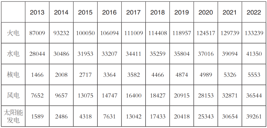 表4 2013-2022年全國電力裝機結(jié)構(gòu)(單位:萬千瓦)