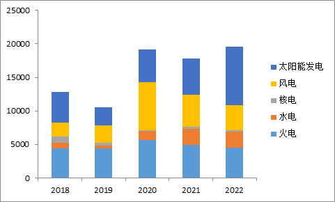2018、2019兩年新增裝機規(guī)模連續(xù)下滑。2020年,在水電、風(fēng)電、太陽能發(fā)電裝機高速增長的帶動下,新增裝機容量大幅提升。2021年受火電、風(fēng)電新增裝機容量減少的影響,整體新增規(guī)模同比出現(xiàn)下滑。2022年,在火電、核電、風(fēng)電新增裝機增速負增長情況下,太陽能發(fā)電新增裝機容量增速達約60%,拉高全年新增裝機增速。