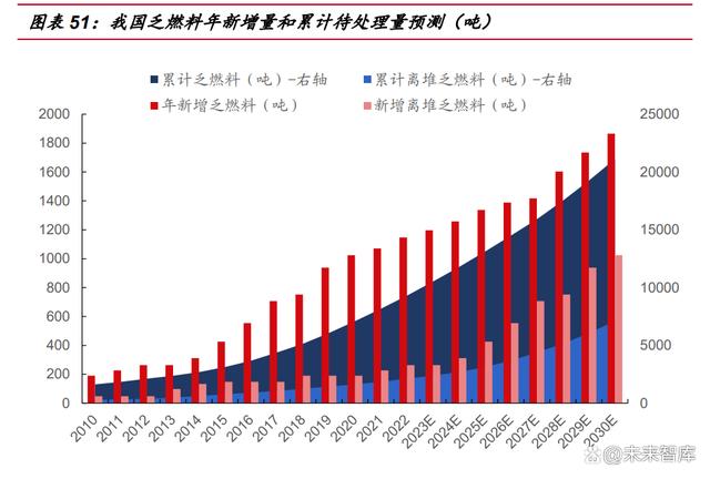 我們根據目前已公布的在運、在建以及核準待建核電機組規(guī)模進行估算,2025 當年將產生 1330 噸乏燃料,累計乏燃料貯存量達 13099 噸;2030 年當年將產生 1883 噸乏燃料,累計 21254 噸,考慮堆內貯存池 10 年臨時貯存規(guī)模,2025 年、 2030 年新產生的離堆乏燃料分別為 426 噸、1024 噸;累計需要被處理的離堆乏燃 料分別達到 3121 噸、7095 噸。綜上,2030 年前國內需建成具備年處理能力達到千 噸以上規(guī)模的乏燃料后處理廠,目前僅 60 噸/年。