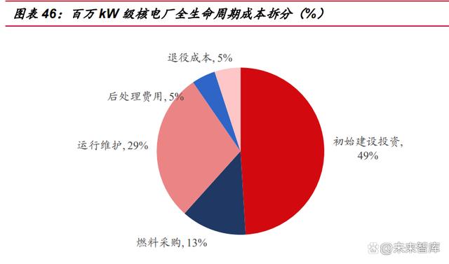 核電在各基荷能源類型中燃料成本占比顯著偏低。核電站具有初始投資高、燃料 費用較低的特點。初始建設投資一般占電站全生命周期的比例為 45-50%,運營成本 40-45%,其中燃料采購成本(包括鈾礦開采、鈾轉化濃縮、燃料組件制造等前段環(huán) 節(jié))僅占 10-15%。經合組織核電站的總燃料成本通常僅為燃煤電廠的 1/3~1/2、為 天然氣聯(lián)合循環(huán)電廠 1/4~1/5。此外值得注意的是,核燃料的后處理成本占核電站全 生命周期成本約 5%,隨著我國核電存量裝機規(guī)模的擴大,乏燃料后處理市場潛力不 容小覷。