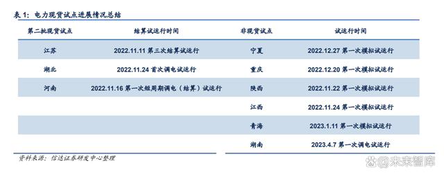 現(xiàn)貨市場(chǎng)分省試運(yùn)行提速,現(xiàn)貨時(shí)代或?qū)?lái)臨。2022 年 11 月,國(guó)家能源局公開(kāi)發(fā)布《電 力現(xiàn)貨市場(chǎng)基本規(guī)則(征求意見(jiàn)稿)》《電力現(xiàn)貨市場(chǎng)監(jiān)管辦法(征求意見(jiàn)稿)》并征求 社會(huì)意見(jiàn),標(biāo)志著全國(guó)范圍內(nèi)的省級(jí)電力現(xiàn)貨市場(chǎng)發(fā)展將出現(xiàn)提速。第一批 8個(gè)試點(diǎn)地區(qū) (南方(以廣東起步)、蒙西、浙江、山西、山東、福建、四川、甘肅)已于 2022 年 6 月 底啟動(dòng)長(zhǎng)周期結(jié)算試運(yùn)行,第二批 6個(gè)試點(diǎn)地區(qū)(上海、江蘇、安徽、遼寧、河南、湖北) 已于 2022 年 7 月底前啟動(dòng)模擬試運(yùn)行。四季度以來(lái),第二批現(xiàn)貨試點(diǎn)中湖北、河南已經(jīng)開(kāi) 始啟動(dòng)調(diào)電試運(yùn)行,江蘇也于 11 月開(kāi)展第三次結(jié)算試運(yùn)行。此外,非現(xiàn)貨試點(diǎn)省份對(duì)于現(xiàn) 貨市場(chǎng)的建設(shè)推進(jìn)積極性也較高:寧夏、重慶、陜西、江西在 2022 年四季度均開(kāi)展首次模 擬試運(yùn)行;青海、湖南也分別于 2023 年 1 月和 4 月開(kāi)展模擬試運(yùn)行和調(diào)電試運(yùn)行。2023 年有望出現(xiàn)全國(guó)范圍內(nèi)的現(xiàn)貨市場(chǎng)熱潮,“現(xiàn)貨時(shí)代”或?qū)?lái)臨。