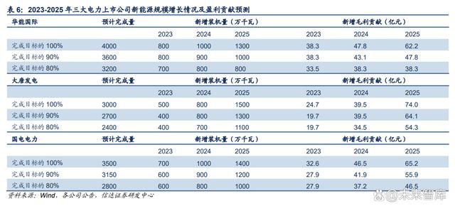 未來(lái)三年新能源裝機(jī)規(guī)模及盈利貢獻(xiàn)有望提速。假設(shè)華能、大唐、國(guó)電三家上市公司未來(lái) 新增的新能源裝機(jī)量中風(fēng)電光伏比例為 4:6,風(fēng)光維持 22 年的發(fā)電小時(shí)數(shù),平均發(fā)電小時(shí) 數(shù)分別為 1770/1841/1731h;平均上網(wǎng)電價(jià) 520 元/兆瓦時(shí);成本收入比為 45%。以完成 “十四五”新能源裝機(jī)規(guī)劃量 90%的情況為例,我們預(yù)計(jì) 2023-2025 年華能國(guó)際新增裝機(jī) 量分別為 800/900/1000 萬(wàn)千瓦,新增毛利貢獻(xiàn)分別達(dá)到 38.3/43.1/47.8 億元;我們預(yù)計(jì) 23-25 年大唐發(fā)電新增裝機(jī)量分別為 400/800/1300 萬(wàn)千瓦,新增毛利貢獻(xiàn)分別達(dá)到 19.7/39.5/64.1 億元;我們預(yù)計(jì) 23-25 年國(guó)電電力新增裝機(jī)量分別為 600/900/1200 萬(wàn)千瓦, 新增毛利貢獻(xiàn)分別達(dá)到 27.9/41.9/55.9 億元。